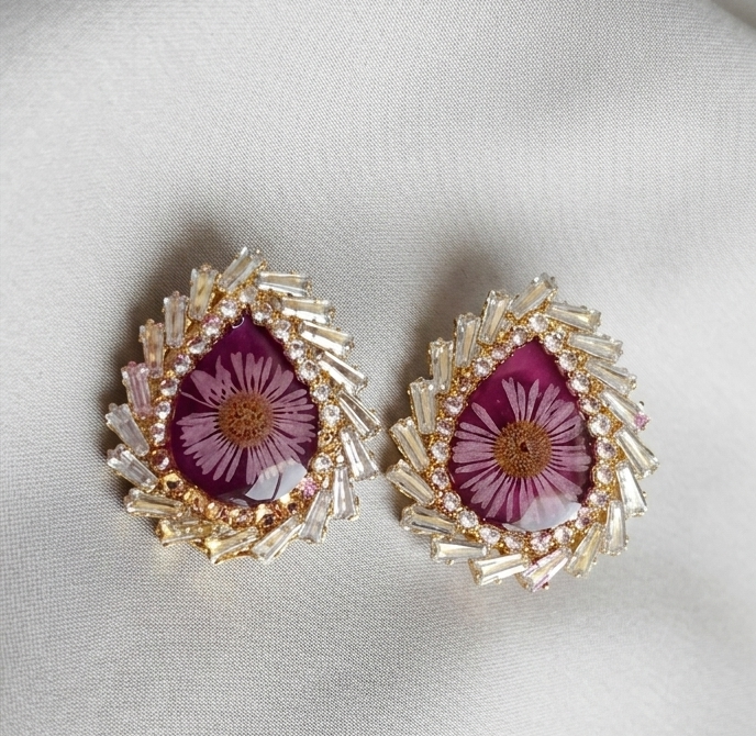 Adorn yourself with the timeless beauty of nature through these exquisite resin-preserved flower earrings. Featuring real purple blossoms encased in high-quality resin, these studs are framed by a brilliant halo of baguette-cut crystals. The teardrop shape and gold-toned setting provide a sophisticated look suitable for weddings, parties, or everyday elegance. Lightweight and durable.