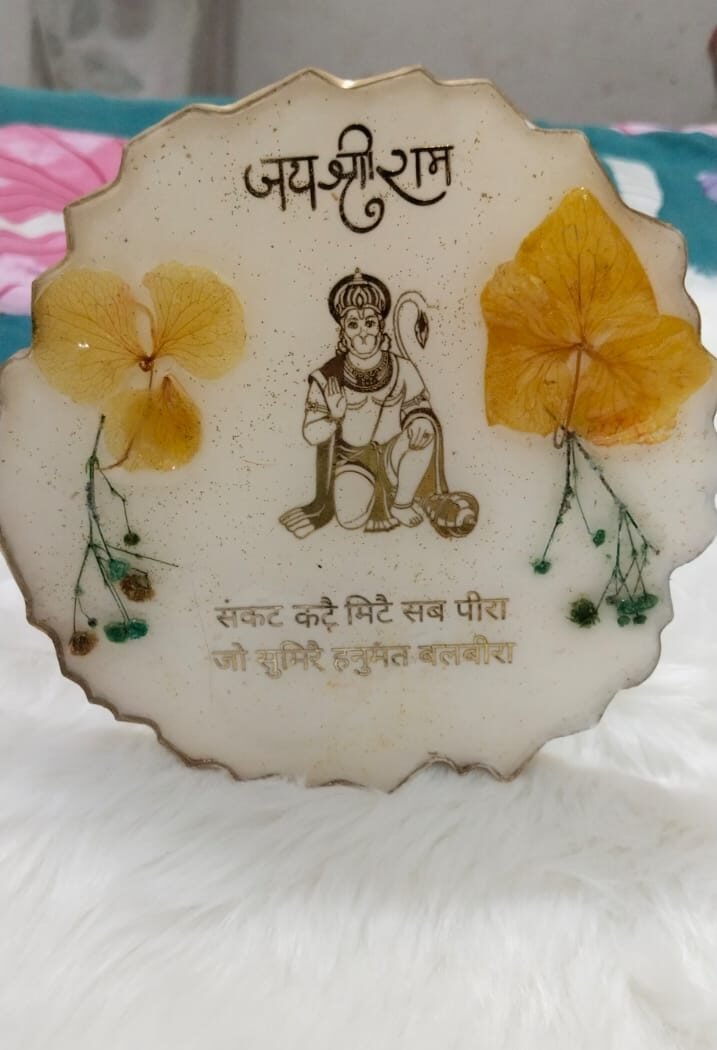 Invite protection and peace into your home with this sacred Lord Hanuman resin plaque, featuring the powerful “Sankat Mochan” verse. This devotional piece is crafted on a milky-white base and adorned with real pressed yellow flowers and green foliage. The elegant gold-scripted “Jai Shree Ram” and Hindi shlokas make it an ideal addition to your home temple or office desk. Its scalloped gold edges and high-gloss finish give it a premium feel suitable for gifting during housewarmings or festivals. A beautiful blend of spirituality and modern art for every devotee.