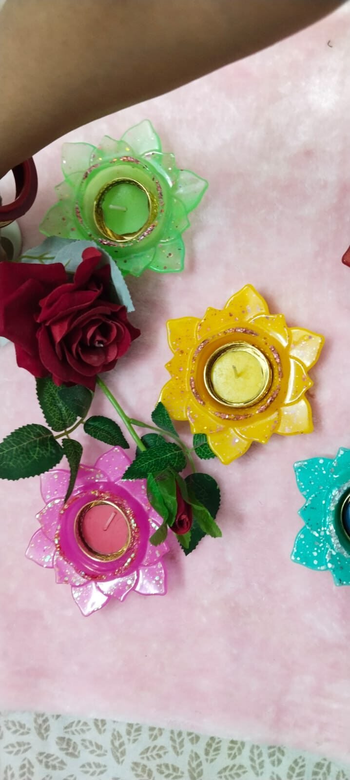 Light up your home with these vibrant, translucent resin tealight holders shaped like blooming lotus flowers. Available in a rainbow of colors including pink, yellow, green, and teal, these holders feature subtle glitter accents that sparkle when the candle is lit. The heat-resistant resin ensures safety while providing a soft, ambient glow through the colorful petals. These are ideal for spiritual altars, balcony decor, or as a colorful centerpiece for dinner parties. Their durable, easy-to-clean design makes them a long-lasting addition to your festive decor collection.