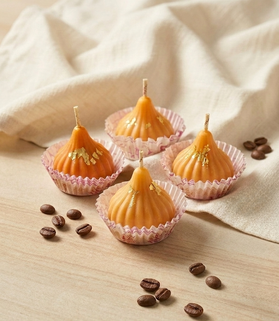 Elevate your home ambiance with these uniquely handcrafted Modak-shaped candles, blending traditional Indian aesthetics. Infused with a rich, energizing aroma, these candles are perfect for festive décor or as a gift. Each piece is delicately adorned with gold leaf accents and sits in a charming cupcake liner. They serve as both a functional aromatic tool and a stunning decorative centerpiece.