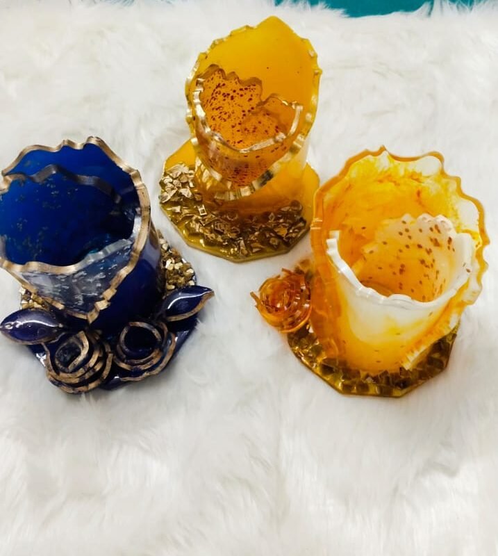 Organize your desk with style using these luxury resin pen and brush holders. Available in deep sapphire blue and golden honey amber, each holder features a unique “cracked ice” textured rim and a base adorned with shimmering gold flakes. The organic, wavy silhouettes give them a contemporary sculptural feel that transforms standard office supplies into art. Sturdy and weighted, they are ideal for holding pens, makeup brushes, or art tools. These artisanal organizers are the perfect sophisticated accent for any modern home or workspace.