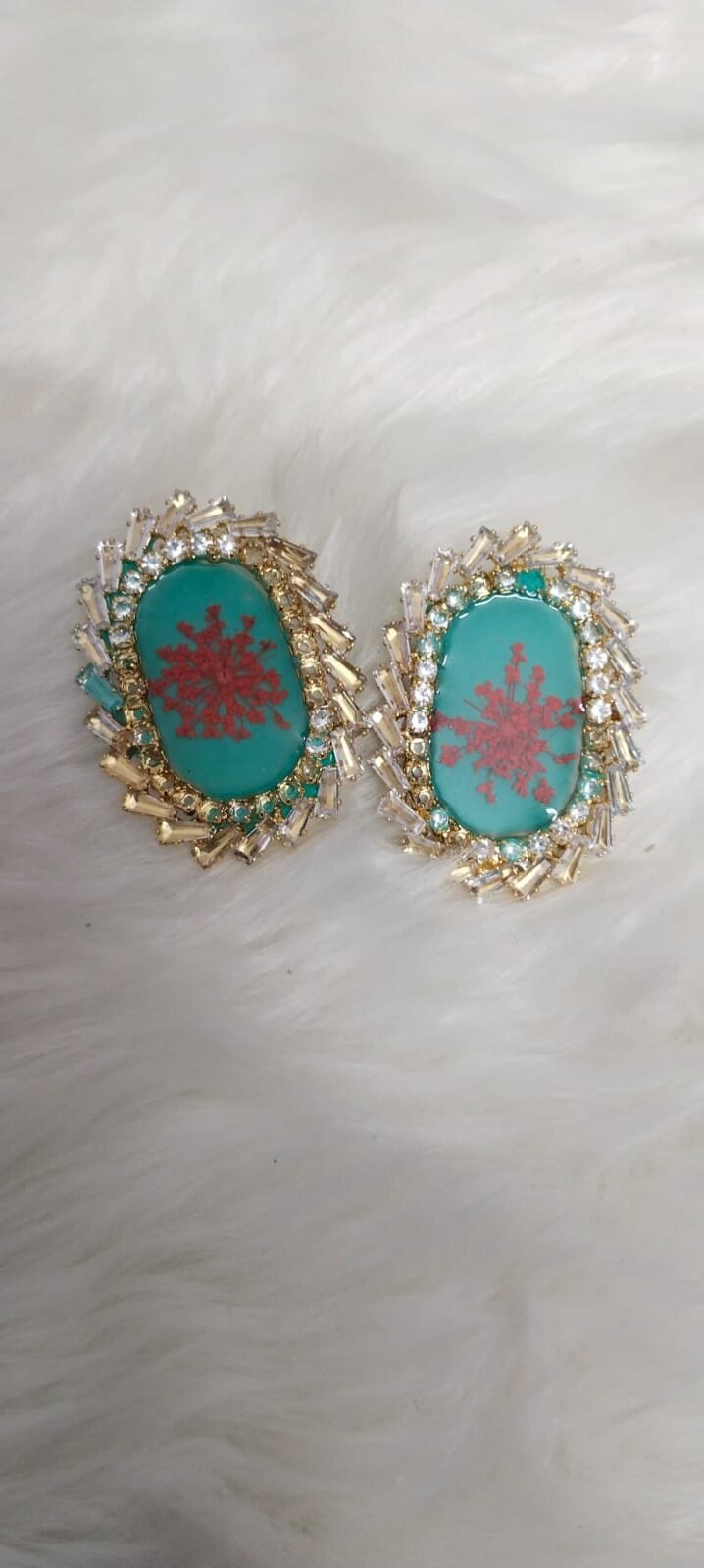 Add a touch of botanical elegance to your jewelry collection with these handcrafted resin stud earrings. Each piece features a vibrant teal base encapsulated with intricate red floral motifs for a striking color contrast. The oval-shaped resin is bordered by high-quality, sparkling crystal rhinestones that catch the light beautifully. Designed to be lightweight and comfortable for all-day wear, these earrings are perfect for both festive occasions and everyday statement looks. A unique gift for nature lovers and fans of artisan craftsmanship.