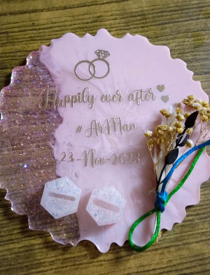 Celebrate your new beginning with this romantic pink blush resin ring platter, customized with your name and engagement date. The tray features a dreamy soft pink swirl design on one side and a shimmering rose-gold glitter geode effect on the other. Adorned with a bundle of dried “baby’s breath” flowers, it offers a rustic yet sophisticated aesthetic for your ceremony. The two hexagonal ring holders are cast in matching glitter resin to keep your bands secure and photogenic. It’s a beautiful, personalized keepsake that captures the sweetness of your special milestone.