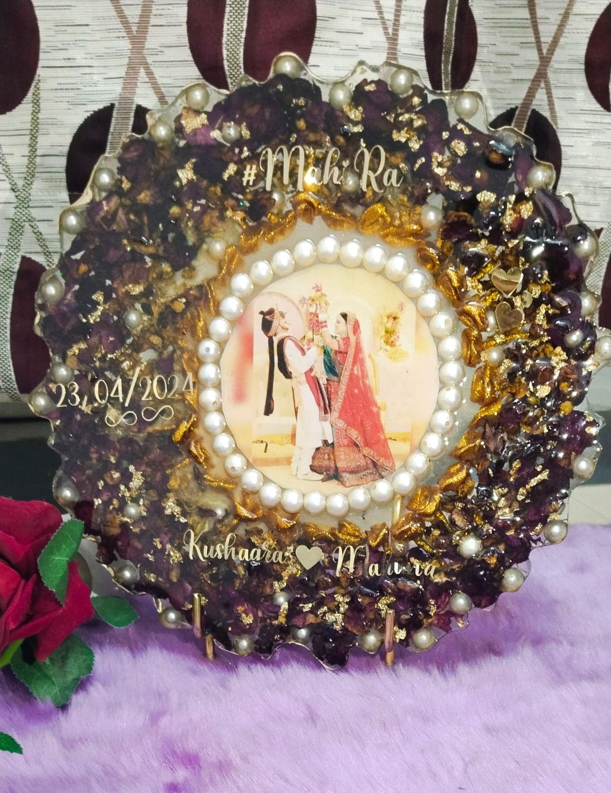 Celebrate your union with this rectangular resin photo frame, featuring a stunning “pearl necklace” inlay and dried floral accents. The creamy pearl-white background provides a sophisticated canvas for your couple’s portraits and the significant date of your event. Touches of purple florals and scattered pearls add a royal dimension to this textured, wavy-edged masterpiece. This frame is designed to stand out, making it a perfect engagement or wedding gift for newlyweds. Each piece is unique, offering a one-of-a-kind way to display your love story.